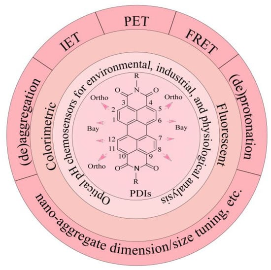 The molecules of perylene 3,4,9,10-tetracarboxyl diimide (PTCDI or PDI) form a series of unique functional semiconductors and conjugated organic dyes or pigments. PDIs have exceptional photo absorption and emission characteristics, excellent thermal, chemical, optical and photochemical stability, as well as outstanding n-type (strong electron affinity) semiconductor properties. These features can be tuned via molecular structure modification, molecular assembly or aggregation, or exogenous chemical action, etc. [,,,]. Such structural and property tunability makes PDIs ideal candidates for development as chemosensors for detection of various chemicals in both liquid and gas phases, especially organic and inorganic ions, and biological species [,,,,]. Very often, the sensitivity and selectivity of the chemosensors are dependent on the pH of the analyte solution, meaning that monitoring and control of the pH are crucial for precise detection of target analytes. Such pH dependence of sensing performance has been reported and reviewed in some previous publications [,,]. Nonetheless, there is a lack of systematic review of quick and precise detection of the pH value itself with PDI-based optical sensors, although such pH probing would be crucial for practical application in the health, pharmaceutic, biological, food and environmental analysis scenarios, wherein the pH may change frequently under various conditions. In 2020, Borisov et al. gave an excellent and quite comprehensive review of optical pH sensors, including a brief introduction of PDI sensors for pH probing []. In 2021, Singh et al. summarized the progress in PDI-based chemosensors, describing briefly their application in the detection of H+ and OH− ions (equivalent of pH) [].