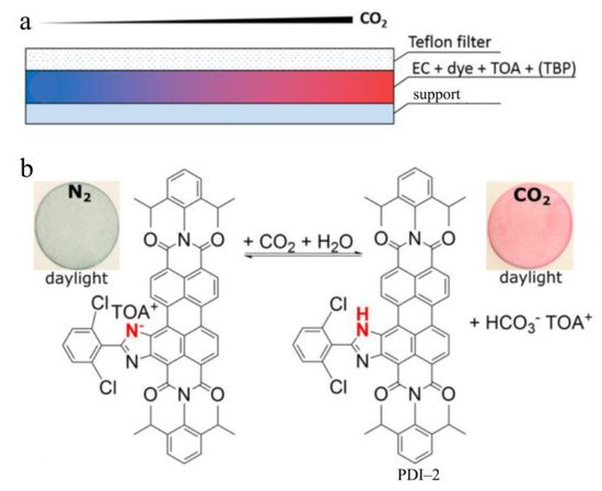 (a) Schematic architecture of the solid-state sensor incorporating PDI−2 as a dye used for probing CO2; (b) Photographs of the sensor strip recorded under daylight before and after exposure to 100% CO2; The colorimetric sensing mechanism based on protonation/deprotonation process mediated by CO2 is also shown. Reproduced with permission from Ref. [].