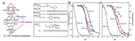 The performance of optical sensors as applied in pH probing relies on the sensing mechanisms in association with the structure and property of the sensor materials, which in turn affect the selectivity, sensitivity, response time, dynamic range, reproducibility and temperature dependence of sensing response. In general, the sensing response of pH probing is based on the protonation induced by binding of H+ ions (protons). The electron-accepting characteristic of PDI skeleton arises mainly from the electron-withdrawing imide groups. Upon functionalization with protonatable electron-donating groups, such as amines, the photoinduced electron transfer (PET) from the amine to the PDI can be modulated by protonation at the amine moiety, thus leading to a sensing response toward protons. Compared to other sensor molecules or materials, PDIs also exhibit good permeability, low cytotoxicity and impressive molecular assembly capability, depending on the rigid polycyclic aromatic core. As a result, PDI sensors have been widely explored for probing extracellular (environmental) and intracellular pH values and pH-relying molecular recognition of inorganic or organic ions, as well as biological species, and so on. Therefore, the main challenges and endeavors undertaken in the past lie mostly in the structural modification and optimization of PDI molecules, especially the side groups, in order to improve their water solubility [,].