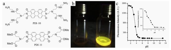 Unlike the above-mentioned molecular architectures, recently, there has been an increasing use of dendrimers (containing three-dimensional branching structures) modified with PDI core in organic electronics, bioimaging, sensors and gene delivery, etc. [,]. The substitution of PDI at the imide position with light-harvesting electron-donating dendrimers can not only increase the molecular solubility but also endow a strong PET effect within the macromolecule systems, thus enabling fluorescence sensing of proton (pH probing) and metal cations [,]. Among them, dendritic polyamidoamine (PAMAM) has attracted considerable attention, which can enable PDI−10 (Figure 8a) with the presence of the tertiary amine receptor unit and long alkylamine terminal groups, having good organic solvent solubility and fluorescence “off–on” pH sensing activity (pKa values of 1.8 and 4.1) []. In contrast, tetraester PDI−11 (Figure 8a), with pKa value of 3.4, showed very distinct fluorescence emission enhancement after acidification of the DMF solution (Figure 8b) []. In alkaline media, both molecules will aggregate, leading to quite weak fluorescence. As demonstrated in Figure 8c, PDI−11 has a relatively strong fluorescence intensity under acidic pH range, perhaps due to the conformational difference arising from the larger branch side-chain dimension of PAMAM than tetraester.