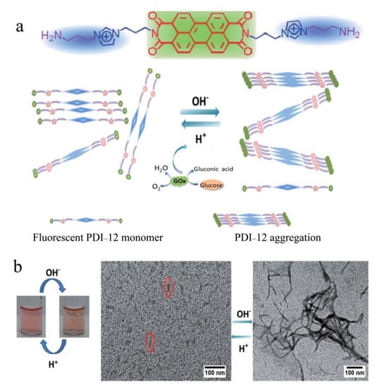 (a) Molecular structure of PDI−12 and the schematic illustration of pH-sensitive reversible self-assembly and its use in fluorescence glucose detection; (b) Photographs of aqueous solution (0.5 mM) of PDI−12 at pH 4.0 (left) and pH 8.0 (right) and the TEM images of PDI−12 at pH 4.0 (left) and pH 7.0 (right). Reproduced with permission from Ref. [].