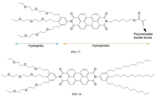In addition to the above-mentioned shape-defined supramolecular assemblies (e.g., nanofibers), some other supramolecular architectures can also be utilized in pH sensing. Inspired by the natural amphiphiles forming biological bilayer membranes in living vesicle systems, some amphiphilic building blocks of PDIs have been synthesized and used for chemosensors [,]. By functionalizing the hydrophobic skeleton of PDI with asymmetric hydrophilic and hydrophobic groups at its imide positions, amphiphilic derivatives PDI−17 and PDI−18 (Figure 11) and the sensing performance were reported []. Such water-soluble molecules can be co-assembled into a bilayer nanoscopic vesicle (acting as an energy acceptor) in aqueous solution, for which water-soluble energy donors can be enclosed inside the vesicle. By adjusting the spectral overlap of donors and acceptors, a controlled pH-sensitive FRET process from the “core” (encapsulated donor) to the “shell” (bilayer dye membrane) can be realized, so as to drive the optical sensing application of such nanocapsule vesicle in aqueous solutions. Ultrasensitive pH response was obtained for the nanocapsule sensor as tested in a wide range of pH 3.0–11.0; the sensing response was revealed as dramatic fluorescence color change, covering the whole visible light range under UV (366 nm) illumination.