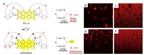 (a) Molecular structure of PDI−24 and its photophysical mechanism for pH probing; (b–e) Fluorescent photographs (under bars of 50 μm) of PDI−24 micelles in living L929 cells. The cells were incubated for 24 h (upper) and 48 h (lower) with PDI−24 concentrations of 1.3 μM (b,d) and 26 μM (c,e). Reproduced with permission from Ref. [].