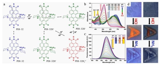 (a) Scheme of the possible resonance structure for PDI−32 (PDI−32H+), explaining the disappearance of the charge transfer absorption band in PDI−32H22+; (b) Absorption and (c) fluorescence emission spectra of PDI−32 (5 μM) in the presence of different concentrations of HCl (0.01–4.0 M) in a methanol/water (9:1, v/v) solution; (d) Photographs of test strips of PDI−32 after addition of HCl and NH3 under ambient (right) and UV light (left). Reproduced with permission from Ref. [].