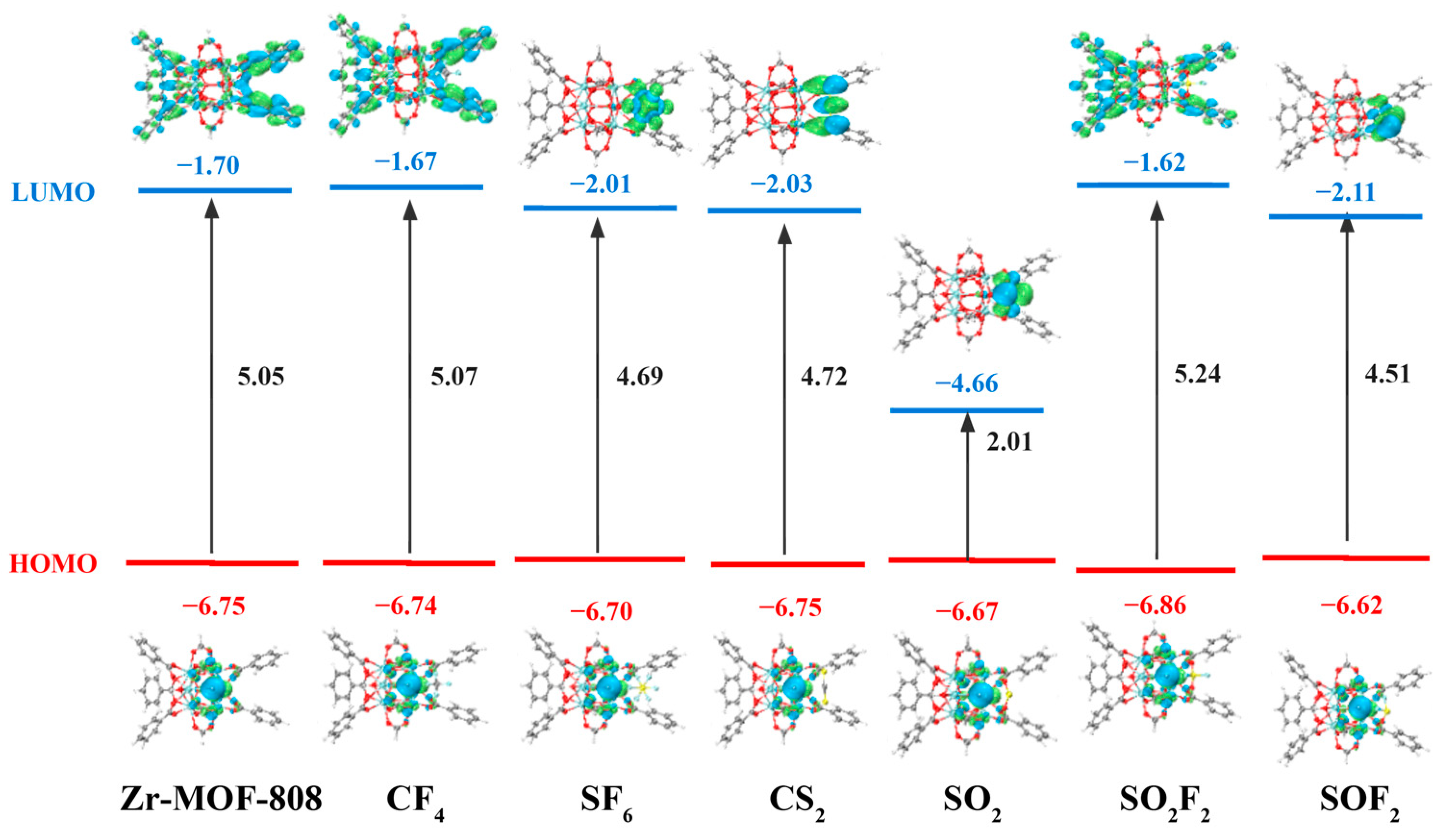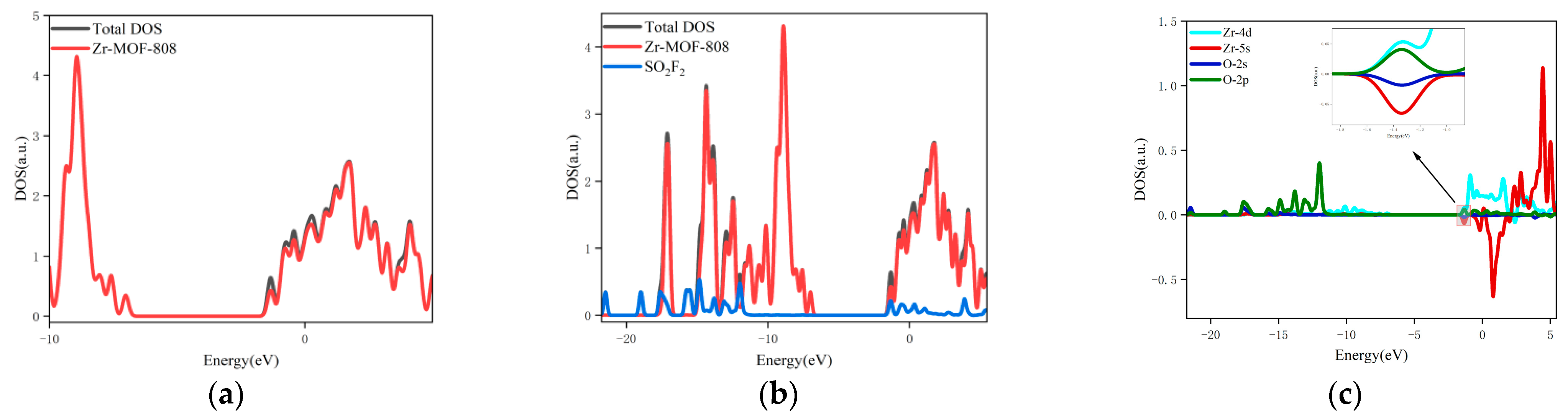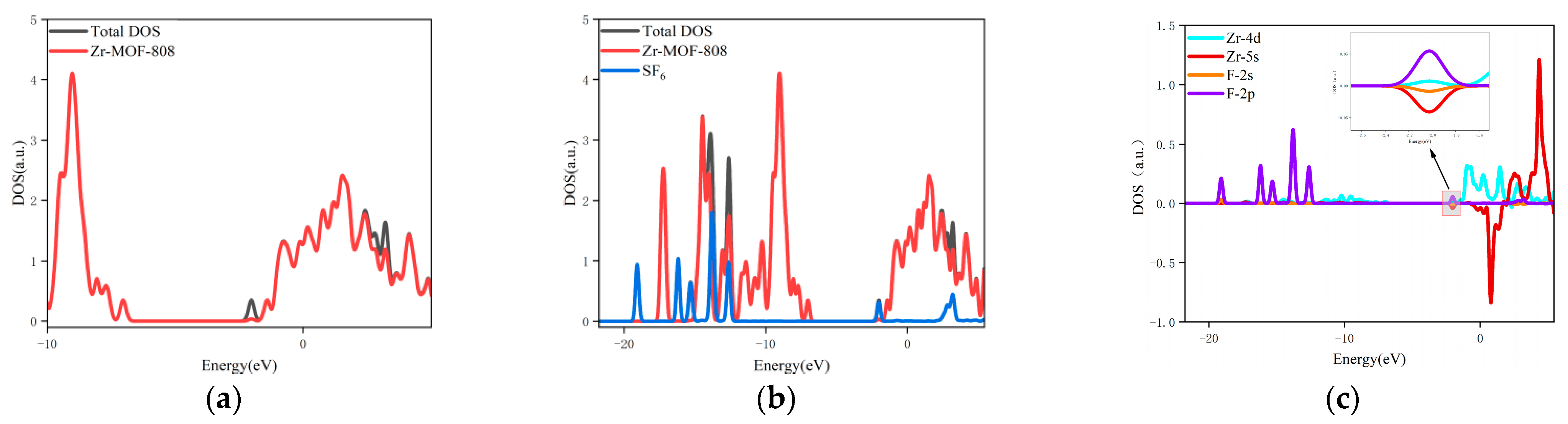 - The changes in the DOS of Zr-MOF-808 Cluster 1 after SF6 adsorption are shown in Figure 6a–c.