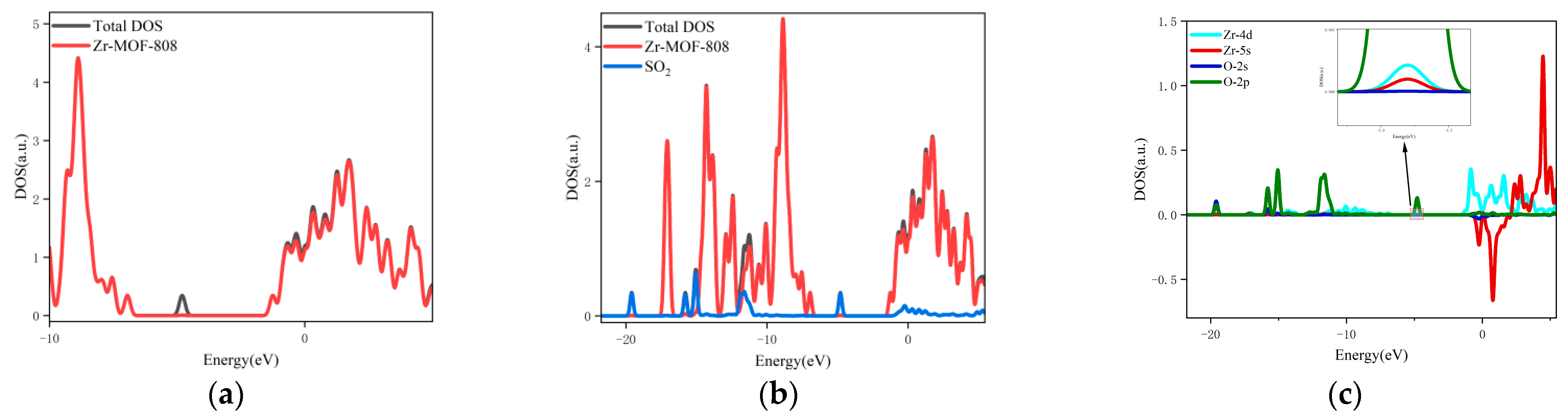 - The changes in the DOS of Zr-MOF-808 Cluster 1 after SO2 adsorption are shown in Figure 9a–c.