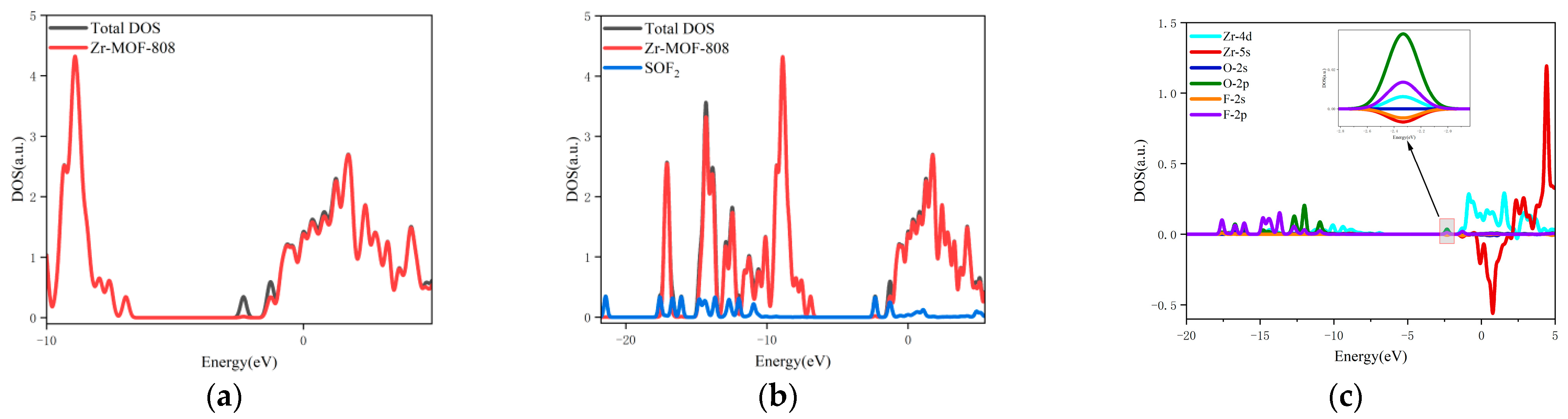- The changes in the DOS of Zr-MOF-808 Cluster 1 after SOF2 adsorption are shown in Figure 11a–c.
