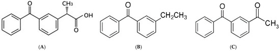 Chemical structure of ketoprofen (A), 3-ethyl benzophenone (B), and 3-acetyl benzophenone (C).