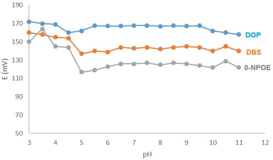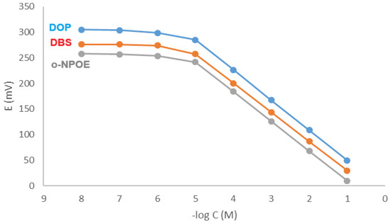 The differences in membrane performance observed among the three different plasticizers may be attributed to the differences in structure and polarity that make differences in ion mobility within the membrane, which can enhance the sensor’s performance by facilitating the movement of charges needed for potentiometric measurements. However, the membrane performance is a specific relationship that depends on the overall membrane composition and the interaction between the plasticizer, the polymer matrix (PVC), and the ion-exchanger [].