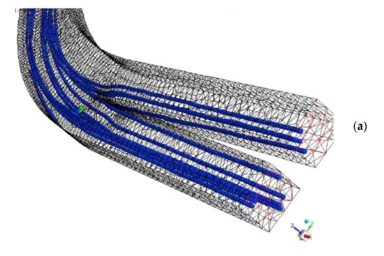 Various combinations of parameters created five different designs that are summarized in Table 1. The separation of particles in the fluidic system was simulated, and the performance of particle separation was compared. For finding the separation performance, the number of particles that are exiting from each outlet was counted. The ratio of the number of particles exiting from the lower outlet and all the particles injected from the inlet for the duration of 60 s is calculated as separation efficiency. As an example, when all the injected particles are escaping from the lower outlet, the performance is assumed to be 100%. Table 2 outlines typical atmospheric air properties that have been used in the simulation step [13,30].