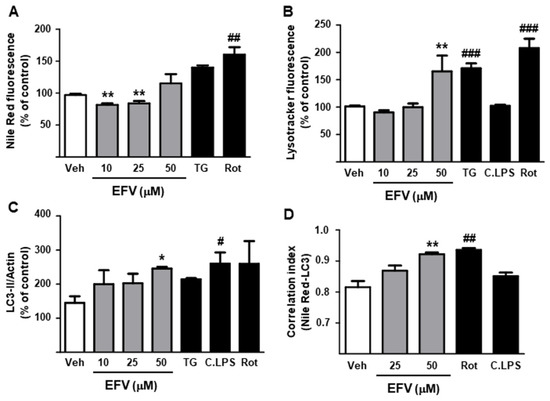 EFV-induced reduction in lipid droplets in LX2 cells is associated with activation of autophagy. (A) Intracellular content of lipid droplets evaluated by Nile Red fluorescence (n = 6). (B,C) Analysis of autophagy markers: lysosome signal (Lysotracker fluorescence) and protein expression of LC3-II (n = 5–6). (D) Correlation index between Nile Red and LC3 fluorescences (n = 5) (E) Representative images obtained from confocal microscopy experiments showing Hoechst 33342, LC3, Nile Red and merge (n = 5). All the data (represented as mean ± SEM) were calculated as a percentage of control (untreated cells) and analyzed by a one-way ANOVA multiple comparison test followed by a Newman–Keuls test (* p < 0.05, ** p < 0.01 versus the respective vehicle). Thapsigargin (TG), rotenone (Rot) and cocktail of LPS (C.LPS) were independently analyzed by a Student’s t-test (# p < 0.05, ## p < 0.01, ### p < 0.001).