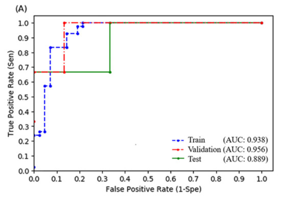 Second, we decided not to apply filters to develop a response map to calculate more radiomic features, because features derived from response maps may lack robustness. However, we may also miss some RILD-related features at the same time. Third, we applied the SMOTE to the training set to redress the class imbalance but oversampling the minority might result in model overfitting. Nevertheless, it seemed that we achieved the acceptable bias-variance trade-off, since the AUROC between different sets was similar (Figure 1 and Figure 2A), which suggested little possibility of overfitting. In addition, most of the performance indexes were comparable between the estimations using cross-validation data and the originally proposed hold-out approach, especially for the random forest model. These results may also indicate that there were no concerns of overfitting in the proposed models (Table S1). Fourth, the median tumor size was 5.6 cm in our study, which was larger compared to some studies [7,9]. This information may remind readers to be cautious when extrapolating our model to the patient with a much smaller HCC. Thus, to reduce the possible biases, we also included the GTV volume and the dose-volumetric parameters when analyzing the predictive factors of the RILD. It seemed that there was no direct relationship between GTV volume and RILD development in our study.