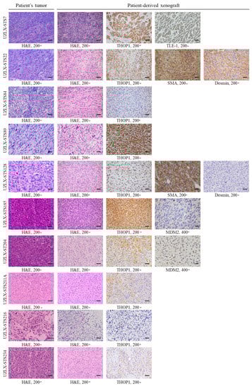 Characterization of the patient-derived sarcoma xenograft models used in this study. Representative H&E and immunostainings of the original patient tumors and the corresponding patient-derived xenografts; scale bar 200×: 50 µm, scale bar 400×: 20 µm. Alpha-SMA: alpha smooth muscle actin; H&E: hematoxylin and eosin; MDM2: mouse double minute 2 homolog; THOP1: thimet oligopeptidase; TLE-1: transducin-like enhancer of split 1; 200×: 200-fold magnification; 400×: 400-fold magnification.