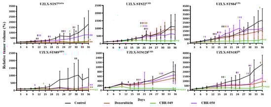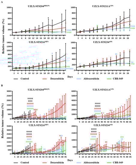 Relative tumor volume (%) compared to baseline in the patient-derived sarcoma xenografts, presented as average ± standard deviation. (A) Graphs until day 29 (short-term experiment); (B) graphs until day 85 (long-term experiment). Statistical significance was calculated using Mann–Whitney U test. #†: number of mice sacrificed during the experiment. * p < 0.05 compared to control; # p < 0.05 compared to doxorubicin (doxo); ** p < 0.005 compared to control; ## p < 0.005 compared to doxo; *** p < 0.0005 compared to control; ### p < 0.0005 compared to doxo.