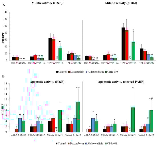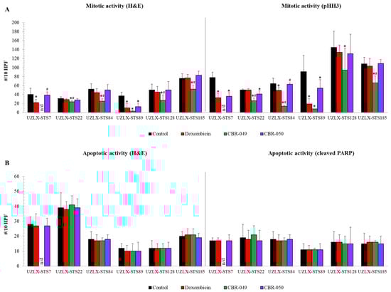 Assessment of mitotic and apoptotic activity of tumors collected at the end of experiment (day 36). (A) Mitotic cell count assessed on H&E and pHH3 staining; (B) Apoptotic cell count assessed on H&E and cleaved PARP staining. Data are presented as average ± standard deviation. CBR-049-treated samples from UZLX-STS7 could not be assessed because of a technical problem that occurred during the embedding of the formalin-fixed tumors in paraffin. * p < 0.05 as compared to control; # p < 0.05 as compared to doxorubicin. H&E: hematoxylin and eosin; pHH3: phospho-histone H3; PARP: poly (ADP-ribose) polymerase; HPF: high power fields.