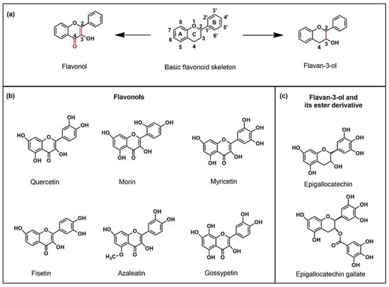 (a) Representative structure of basic flavonoid skeleton (phenylbenzopyran) along with its two subclasses used in this study—flavonol and flavanol demonstrating the differences at C4 position and the bond between C2 and C3. (b) Chemical structures of six flavonols (quercetin, morin, myricetin, fisetin, azaleatin, gossypetin) and (c) flavan-3-ol (epigallocatechin) and its ester derivative (epigallogatechin gallate) used in this study.