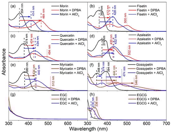 UV-visible spectra of flavonoids showing absorption bands and their shifts after they were treated with DPBA and AlCl3. Impact of DPBA and AlCl3 into the band shift of (a) morin, (b) fisetin, (c) quercetin, (d) azaleatin, (e) myricetin, (f) gossypetin, (g) epigallocatechin (EGC) and (h) epigallocatechin gallate (EGCG). The absorption spectra of DPBA and AlCl3 in DMSO in absence of flavonoids are provided in the Supplementary Materials in Figure S2. Dashed and dotted lines represent the positions of absorption peaks before and after their shifts, respectively.