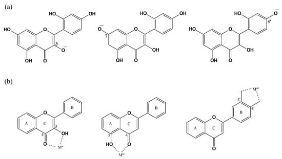 (a) The readily ionizable sites (C3, C7, and C4′) of flavonoids. (b) Presence of -OH or =O groups at the nearby C-atom favors the complexation process.