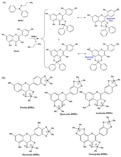 (a) A schematic presentation of the complexation of DPBA with morin and the plausible quinonoid forms. (b) The plausible molecular structures of complexes formed on treatment of fisetin, quercetin, azaleatin, myricetin and gossypetin with DPBA.