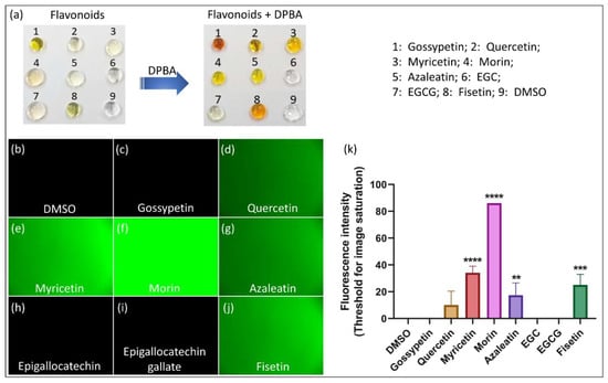 In vitro investigation of fluorescence response of flavonoids after interaction with DPBA. (a) Images of the flavonoid droplets on silanized glass slide before and after their treatment with DPBA. The concentration of flavonoids prepared in DMSO is 100 mM while the concentration of DPBA solution used for the treatment is 0.5% in EtOH. The 1:1 (v/v) mixture was dropped (~1 μL) on the silanized glass slide. (b–j) Optical microscopic images (Ex. 470 nm) of the flavonoids treated with DPBA where morin, myricetin, fisetin, azaleatin and quercetin exhibited fluorescence and (k) a comparison of their relative intensity. The error bars represent the mean ± SEM. **** p < 0.0001, *** p < 0.001, ** p < 0.01, one-way ANOVA followed by Tukey’s multiple comparisons test (k).