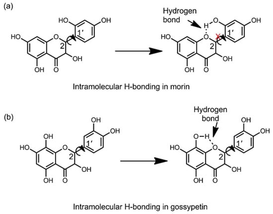 Possibility of intramolecular H-bonding in morin can restrict the free rotation of the cinnamoyl and benzoyl moieties around C1′-C2 single bond (a) while such contribution in gossypetin is not feasible (b).