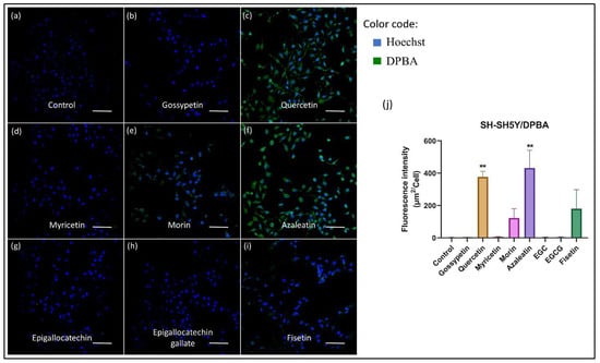 Fluorescence microscopic images (Ex. 470 nm) of human neuroblastoma (SH-SY5Y) cells after flavonoid uptake followed by DPBA treatment. Cells are treated with (a) DMSO (flavonoid absent, control), (b) azaleatin, (c) quercetin, (d) fisetin, (e) morin, (f) myricetin, (g) gossypetin, (h) epigallocatechin, and (i) epigallocatechin gallate. Flavonoid treatment (100 μM) is carried out for 1 h, while the enhancer DPBA solution (0.5% wt./v, in ethanol) is employed for 10 min. The scale bars represent 100 μm. Nucleus was stained using Hoechst. Among these, the azaleatin, quercetin, fisetin and morin treated cells showed fluorescence while it was not detectable in gossypetin, epigallocatechin, and epigallocatechin gallate treated cell. Panel (j) represents a comparison of fluorescence intensity exhibited by the flavonoid treated cells. The error bars represent the mean ± SEM. ** p < 0.01, one-way ANOVA followed by Tukey’s multiple comparisons test (j).