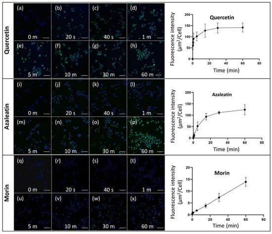 Fluorescent microscopic images of flavonoid uptaken SH-SY5Y cells treated with DPBA for various durations, (a–h) quercetin, (i–p) azaleatin and (q–x) morin. Increase in fluorescence intensity as a function of treatment time are presented for each flavo.