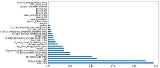 Thus far, no correlation of the predictions with image data is carried out. A corresponding adjustment is already planned, as every included patient has an MRI to confirm lumbar disc herniation. However, we do not expect that image data will cause a significant change in prediction quality. It has been shown previously that imaging and clinical complaints hardly correlate [,]. This can also be seen through our present results, which reflect the relevance of psychological factors and general comorbidities.