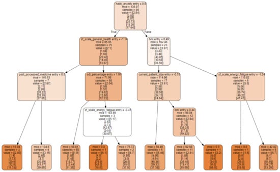 It is frequently discussed which factors lead to a worse or better course of disease after lumbar disc herniation [,,]. The machine learning algorithm established here is based on a decision tree regression that allows insight into the relevant factors. It is striking that the central starting point for a good prediction quality is the HADS anxiety score. This confirms the immense role of psychological factors on the pathogenesis of neuropathic pain due to lumbar disc herniation. The other important factors are the typical suspects. These include BMI and the general perception of one’s own health, followed by the extent of pre-existing diseases and medications as a measure of the actual pre-existing medical conditions. This confirms on the one hand known associations with the development of neuropathic pain, such as the influence of BMI [,], but on the other hand also reveals new aspects that need to be investigated in more detail in the further course of this study.