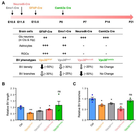 Quantification of BV length and branches of different Cre lines. (A) Time graph illustrating the efficiency time and space of the Emx1-Cre, Neurod6-Cre, GFAP-Cre, and Camk2a-Cre lines that were used to delete Vps35 in the embryonic and perinatal NSCs and NPCs, as well as BV phenotypes in corresponding conditional knockout mice with different Cre lines. (B) Summary of relative BV length in conditional knockout mice with different Cre lines (n = 3 mice per genotype; two-tailed unpaired t test). (C) Summary of relative BV branches in conditional knockout mice with different Cre lines (n = 3 mice per genotype; two-tailed unpaired t test). Individual data points are shown as dots with group mean ± SEM; * p < 0.05; ** p < 0.01; ns., not significant. ++, +++: The different amount of Cre expression in indicated cell types.
