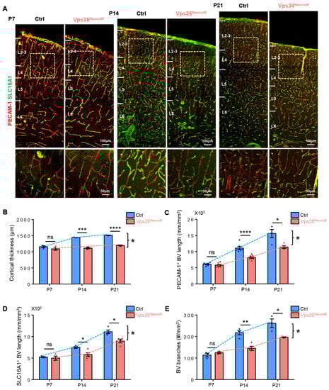 We further tested this view by examining cortical brain BV morphology (e.g., length and branches) at various neonatal ages (e.g., P7, P14, and P21) in control and Vps35Neurod6 mice. The BV morphology was observed by coimmunostaining analysis using antibodies against PECAM-1 (a marker for ECs in all types of BVs) and SLC16A1 (solute carrier family 16 member 1) (a marker of ECs of veins and capillaries) [,]. At P7, the BV length and branches in the mutant cortex were comparable with those of control mice (Figure 3A,C–E), but at both P14 and P21, decreased BV densities and branches became obvious in the mutant mice (Figure 3A,C–E). These results further defined the critical time window, P14–P21, for BV deficits in Vps35Neurod6 mice, implicating a critical role of neuronal Vps35 in promoting BV branching/maturation. These results also suggest that a decrease BV density and branch points in the Vps35Neurod6 cortex are likely occur largely in veins and capillaries.