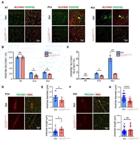 We then examined other types of BV-associated cells, such as pericytes and arterioles. in the cortex of control and Vps35Neurod6 mice. Pericytes, marked by PDGFRβ, wrap around blood capillaries/veins not only as scaffolding but also communicating with ECs by direct physical contact and paracrine signaling pathways [,]. As shown in Figure 4A–C, PDGFRβ+ pericytes were tightly associated with SLC16A1+ capillaries/veins, which were markedly reduced in the mutant cortex at P14 and P21 but not P7, as compared with those of littermate controls (Figure 4A,B), suggesting an age-dependent BV-pericyte deficit. Notice that there were PDGFRβ+, but SLC16A1− BVs in P14 and P21 control mice, and were undetectable in the Vps35Neurod6 mice (Figure 4A,C). Considering reports that PDGFRβ is also expressed in smooth muscle cells (SMCs), in addition to pericytes [,], these results suggest that both pericytes and SMCs might be reduced in Vps35Neurod6 mutant mice. We then asked whether SMA (smooth muscle actin)-marked arterioles were deficient in the mutant mice. Immunostaining analysis using anti-SMA showed obviously thinner arterioles in the mutant cortex than those of controls, whereas the length of arterioles in the mutant cortex appeared to be comparable with that of control mice (Figure 4D–G). These results thus demonstrate deficits in BV veins and capillaries, as well as arterioles, in P14 and P21 Vps35Neurod6 mutant mice.