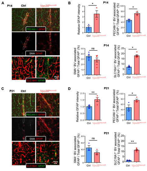 An NVU (neurovascular unit) consists of neurons, astrocytes, microglia, pericytes, VSMCs (vascular smooth muscle cells), and ECs. We thus asked whether astrocytes are altered in the mutant cortex, as they fulfill critical functions in regulating BV homeostasis and function [,]. Coimmunostaining analysis using antibodies against SMA, PECAM-1, and GFAP (a marker for reactive astrocytes) showed that in P14 and P21 cortexes of control mice, a small number of GFAP+ astrocytes were detectable, which were tightly associated with the SMA+ large vessels or arterioles (Figure 6A,C). However, in Vps35 mutant mice, the GFAP+ astrocytes were significantly increased (Figure 6A–D). In addition to the large vessels/arterioles, the GFAP+ astrocytes were also associated with the small vessels (veins and capillaries), as these vessels were marked with both PECAM-1 and SLC16A1 (Figure 6A–D). The increased GFAP protein level in Vps35Neurod6 cortical homogenates at P14 was confirmed by Western blot analyses (Figure 6E,F). We also detected increased GFAP mRNA level by RT-PCR in Vps35Neurod6 mice at P21 (Figure 6G). These results suggest a marked increase in BV-associated GFAP+ reactive astrocytes in the mutant cortex. Additionally, examining GFAP+ astrocytes in the hippocampus showed a similar increase in BV-associated GFAP+ astrocytes (Figure S4A–I). Again, at P7, few to no changes in SMA+ arterioles or BV-associated GFAP+ astrocytes were detected in the mutant mice (Figure S5A,B).