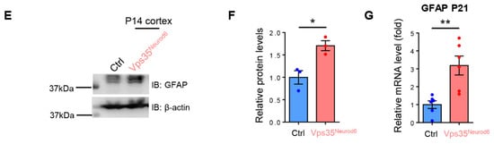 Altered GFAP+ astrocyte distribution in Vps35Neurod6 cortex. (A) Representative images of cortical brain sections coimmunostained with PECAM-1, SMA, SLC16A1, and GFAP at P14. (B) Quantification analysis of GFAP intensity, PECAM-1+ BV associated with GFAP, SMA+ BV associated with GFAP, and SLC16A1+ BV associated with GFAP in control and Vps35Neurod6 mice (n = 3~4 mice per group; two-tailed unpaired t test). (C) Representative images of cortical brain sections coimmunostained with PECAM-1, SMA, SLC16A1, and GFAP at P21. (D) Quantification analysis of GFAP intensity, PECAM-1+ BV associated with GFAP, SMA+ BV associated with GFAP, and SLC16A1+ BV associated with GFAP in control and Vps35Neurod6 mice (n = 3~4 mice per group; two-tailed unpaired t test). (E,F) Western blot analyses (E) and quantification analysis (F) of GFAP level in the cortex taken from Vps35f/f and Vps35Neurod6 animals. β-actin was employed as a loading control (n = 3 animals per genotype; two-tailed unpaired t test). (G) Analysis of GFAP mRNA level in Vps35f/f and Vps35Neurod6 animals at P21 (n = 3 animals per genotype; two-tailed unpaired t test). Scale bars as indicated in each panel. Individual data points are shown as dots with group mean ± SEM; * p < 0.05; ** p < 0.01; ns., not significant.