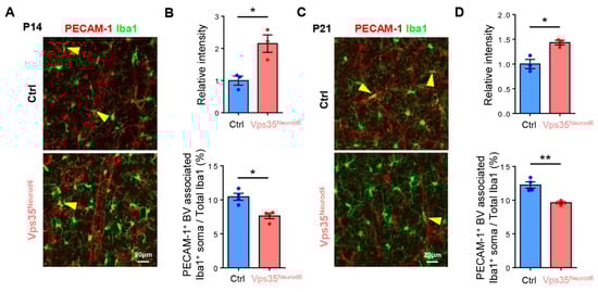 Our results show that neuronal Vps35-KO reduced the microglia–BV association. Microglia are specialized macrophages of the CNS involved in immune regulation, tissue development, homeostasis, and wound repair [,]. Microglial development starts at E8.5 and remains active, remodeling during the postnatal age [,,]. It is known that microglial progenitors migrate into the brain around E8.5 and E14.5, start to colonize in the brain after E14.5, and then increase their proliferation and density gradually [,,]. In addition to immune function, it is worth noting that microglia are often associated with newly forming blood vessels, where they could contribute positively to angiogenesis [], and microglial depletion in the developing CNS results in a sparser network [,,]. Similar to the microglia for the angiogenesis in the brain, tumor-associated macrophages are also known to be critical for tumor-associated angiogenesis [,]. These results suggest that neuronal Vps35-KO may reduce the microglia–BV association, thus decreasing BV branching.