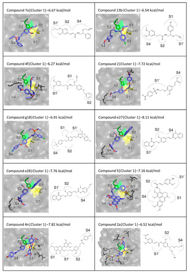 The considerable variety in the structure of the ligands in this category is reflected in a broad range of binding energies (from −6.27 to −8.40 kcal/mol) and a wide diversity of binding modes. The binding energy and detailed interactions for each compound are presented in Table 4. A general observation about the binding of the chemically synthesized derivatives, as seen in Figure 11, is that in a considerable number of them, for cluster 1, the phenolic moiety in FA appears to be located between the S2 and S1′ subsites, more towards S2. In this position, it is in the close vicinity of the catalytic dyad, as seen, for example, in the cases of compounds 7a, 2, and g18. Particularly in the cases of compound D4, FA dimer, and trimers, the phenolic ring is stabilized closer to the S1´ subsite, blocking access to the area around the catalytic residues even more effectively. The binding modes of the second and third clusters were also taken into consideration, but no evident binding pattern was observed (Figure S8).