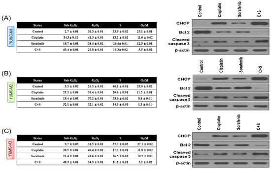 Next, we investigated the mechanism of the combinational anticancer effects of the co-treatment with cisplatin and sorafenib in YUMC-M1, M2, and M3 cells. We analyzed the expression levels of endoplasmic reticulum (ER) stress markers (C/EBP homologous protein (CHOP)) and apoptotic signaling pathway markers (B-cell lymphoma 2 (Bcl-2) and cleaved caspase 3) in YUMC-M1, M2, and M3 cells using flow cytometry, immunoblotting (whole-cell lysate or cellular fractionation), and immunofluorescence analyses. The combination of cisplatin and sorafenib at low doses significantly induced the sub-G0/G1 population, resulting in the induction of ER stress-mediated apoptosis (Figure 4A–C, right panel) in YUMC-M1, M2, and M3 cells compared with either agent alone (Figure 4A–C, left panel) and a strong inhibition of YUMC-M1, M2, and M3 cells. Immunoblot analysis of the protein expression levels indicated that the co-treatment with cisplatin and sorafenib led to a marked induction of CHOP and cleaved caspase 3 levels, which are active apoptosis markers associated with ER stress, whereas compared with either agent alone, the co-treatment at low doses resulted in a decrease in Bcl-2 level, which is a positive regulator of anti-apoptosis. Immunofluorescence analysis showed that cytochrome c was translocated to the nucleus, suggesting that the co-treatment with cisplatin and sorafenib increased apoptosis via a cytochrome c-dependent pathway (Figure 4D). Immunoblot analysis after cellular fractionation confirmed that cytochrome c was translocated to the nucleus after the co-treatment or treatment with either agent alone (Figure 4E). To sum up, these results showed that apoptosis was most caused by co-treatment with cisplatin and sorafenib through caspase- and cytochrome c-dependent pathways in patient-derived MTC cell lines.