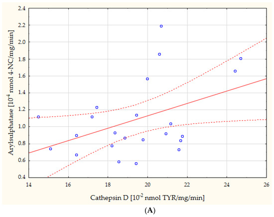 The present study showed no statistically significant differences regarding the activities of lysosomal enzymes (AcP, CTS D, ASA) determined in the whole groups of cataract patients and healthy controls. Taking the division by gender into account, statistically significantly higher AcP activity was demonstrated in the females with cataract, versus the female controls. Acid hydrolases are involved in the process of tissue remodeling and reorganization, possibly in a variety of pathological conditions of the lens, as well [31], similarly to other lysosomal enzymes. It is currently believed that lysosomes play a key part in maintaining cellular and tissue health [32]. They can regulate inflammation both positively and negatively [33]. Lysosomal enzymes, in small amounts, constantly leak from lysosomes into the extracellular space and then into the blood. This increased release may, in turn, be selective and may indicate tissue remodeling and/or pathological processes [34]. The present study demonstrated a positive correlation between serum activities of CTS D and ASA in cataract patients (r = 0.43, p = 0.039; Figure 3A) and between serum activities of AcP and ASA in healthy controls (r = 0.35, p = 0.046; Figure 3B), which may suggest the nonselective permeation of enzymes from lysosomes. The available literature lacks studies similar to the one presented in this paper. Hiraoka et al. [35] have demonstrated, however, that in the aqueous humor obtained from patients with senile cataract but no other ocular diseases, lysosomal phospholipase A2 activity was lower than in the aqueous humor from patients with cataract accompanied by chronic uveitis.