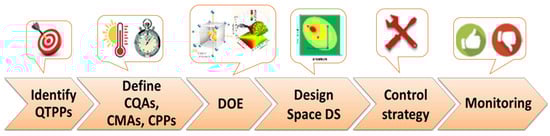 After the publication of the International Conference on Harmonization of Technical Requirements for Registration of Pharmaceuticals for Human Use considerations (ICH) guidelines Q8 (R2), Q9, Q10, and Q11 [,,,], regulatory agencies (Food and Drug Administration—FDA and European Medicines Agency—EMA) approved the Quality by Design (QbD) approach. The ICH Q8 guideline recommended the integration of the “quality by design (QbD)” concept into the pharmaceutical industry [].