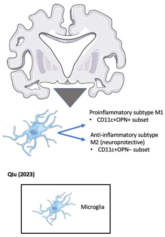 | Qiu (2023) [] | Definition of the contribution of an Osteopontin-producing CD11c(+) microglial subset to Alzheimer’s disease (mouse study) | Identifies a subset of CD11+ microglia that are the sole source of OPN in ADtg mice: