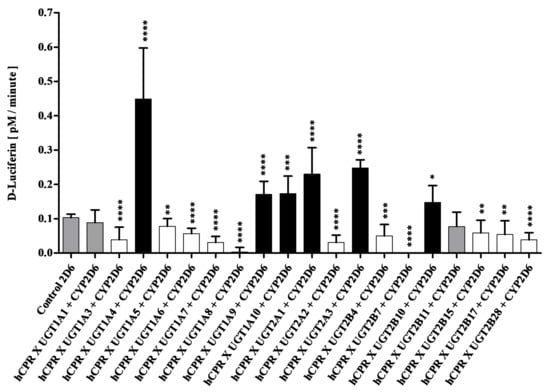 Enzymatic activities of enzyme bags prepared from diploid strains co-expressing CYP2D6, CPR, and different UGTs as indicated. Activities towards the substrate Luciferin-MEEGE are shown in comparison to the control strain SAN300 (which co-expresses CYP2D6 and CPR without a UGT). Activities that are not different from the control are shown in grey, while those that are statistically significantly higher or lower than the control are shown in black or white, respectively. * p < 0.05, ** p < 0.01, *** p < 0.005, **** p < 0.001.