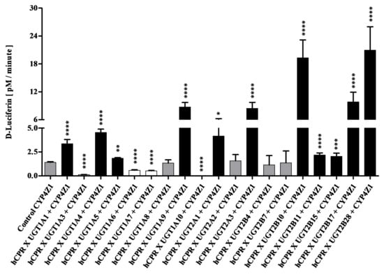 Strains co-expressing CYP4Z1 and UGTs were tested for CYP activity using the substrate Luciferin-4FBE. In these experiments, co-expression of eleven UGTs led to statistically significant (p < 0.05) activity increases, while four caused an activity decrease (p < 0.005), and another four had no effect (Figure 4). Interestingly, activity increase factors were higher than seen with CYP2D6, spanning a range of 1.3 (UGT1A5) to 15 (UGT2B28); a strong increase was also seen for UGT2B10 (14 folds). With respect to activity reduction, co-expression of two UGTs (1A6 and 1A7) had a moderate effect (factors 2.4 and 2.7), while UGT1A3 reduced CYP4Z1 activity by a factor of eleven, and UGT1A10 completely abolished this activity. In view of the findings reported above, it was unexpected that co-expression of UGT2B7 did not have any effect on CYP4Z1 activity.