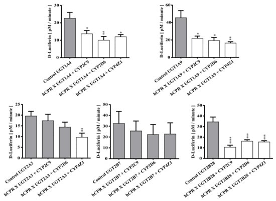 Next, we decided to test for a possible effect of CYP co-expression on the activity of five UGTs (UGT1A4, 1A9, 2A3, 2B7, and 2B28). Again, a luciferin-based probe substrate was used (UGT-Glo substrate A). It was found that the activities of UGT1A4, UGT1A9, and UGT2B28, respectively, were always reduced (p < 0.05) upon co-expression with each of the three CYPs tested (Figure 5), while UGT2B7 activity was not affected at all. In the case of UGT2A3, only CYP4Z1 co-expression led to reduced activity, while the other two CYPs had no statistically significant influence (p > 0.05). Activation of UGT activity was not observed for any UGT-CYP combination. In conclusion, these data show that co-expression of CYPs leads to differential effects on UGT activity, just as UGT co-expression affects CYP activities (see above).