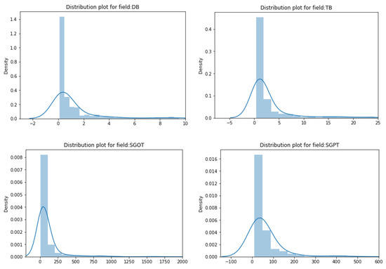 Distribution curves can be plotted to check whether the data is skewed or not. When the distribution curve of the data is distorted towards either the left or right side, then it is said to be skewed. Skewed data can affect performance by violating model assumptions or by affecting the interpretation of feature importances [25]. In the ILPD dataset, the features that are skewed are: ‘A/G’, ‘TB’, ‘AP’, ‘SGPT’, ‘DB’, and ‘SGOT’. There are various transformations available for handling the skewed data, but in this work, the ‘log1p’ transformation is used. It effectively helps to balance the distribution of the curve. The formula used for the ‘log1p’ transformation is given below Equation (1). The skewness of columns can be observed in Figure 4.