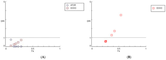 For MCF-7 cells, the combinations of DOX with ATOR and ATOR with NIT showed a DRI < 1 (Figure 16A,C), which indicates that there should be no dose reduction, i.e., these combinations show an unfavorable dose reduction. In contrast, the combinations of DOX with NIT and of DOX with ATOR and NIT (Figure 16B,D) had a DRI > 1, which shows that these combinations can benefit from favorable dose reduction.