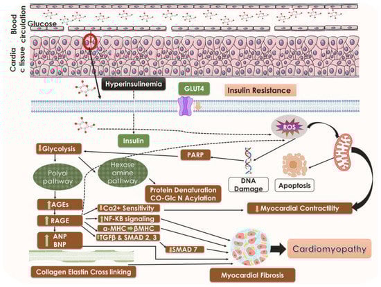 The accumulation of AGEs leads to interactions with RAGE, remodeling of the extracellular matrix with collagen elastin cross-linkage, activation of the NF-κB signaling pathway, production of TGF-β and proinflammatory cytokines, enhanced cardiac oxidative stress by ROS production, reduction in Ca2+ reuptake into the sarcoplasmic reticulum, myosin heavy chain (MHC) shift from α-MHC to β-MHC, and upregulation of atrial natriuretic peptide and BNP. These changes result in myocyte enlargement and myocardial fibrosis [,]. The overproduction of free radicals in mitochondria leads to reduced myocardial contractility and subsequent myocardial fibrosis. The oxidative stress also leads to apoptosis of cardiomyocytes and damage to cellular DNA. This oxidative stress-induced DNA damage activates several downstream cascade mechanisms that are involved in DNA repair and programmed cell death through increased levels of poly (ADP-ribose) polymerase enzymes (PARP). This shifts the pathway of glucose metabolism from its usual glycolytic pathway to an alternative pathway resulting in the generation of different mediators that cause diabetes-induced cellular damage [].