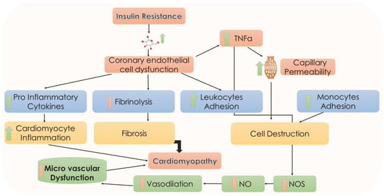 Insulin resistance and DCM. Coronary endothelial cell dysfunction may cause an increase in proinflammatory cytokines, TNFα, leukocytes, and monocyte adhesion and a decrease in fibrinolysis. All these sequence events may cause a decrease in microvascular dysfunction in the heart. Arrows represent downstream events. NO, nitric oxide; NOS, nitric oxide synthetase; TNFα, tumor necrosis factor-α.