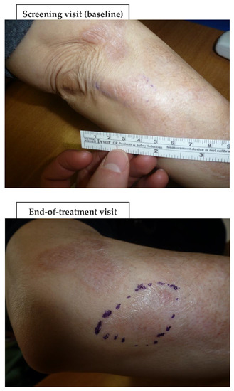 Photographs were taken at a distance of 20 to 30 cm of the patient’s fibroatrophic skin lesions to record dimensions, calculated area (mm2, millimeter ruler), and location.