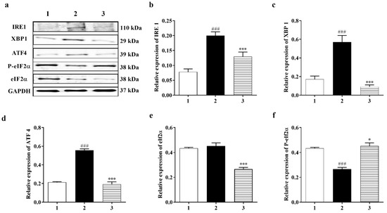 A 12% sodium dodecyl sulfate–polyacrylamide gel electrophoresis was used to separate protein samples, which were transferred onto nitrocellulose membranes. A Western blot was conducted as described before [37] with the following primary antibodies overnight: Abcam (Waltham, MA 02453, USA): GRP 78, Hsp 70, Hsp 27, activating transcription factor 4 (ATF4), Caspase- 12, IRE1 and X-box-binding protein 1 (XBP-1) (1:500); Cell Signaling(Danvers, MA 01923, USA): GAPDH (1:3000), Beclin 1, eukaryotic translation initiation factor 2 α (eIF2α), P-eIF2α, P-STAT 3, Bax, AKT, phosphorylated AKT (p-AKT) and Cleaved Caspase-3 (1:500); Santa Cruz: CHOP/GADD153) and Bcl2 (1:500); Novus Biologicals (Centennial, CO 80112, USA): ATF6 (1:1500) (Supplementary Table S2). The membranes were washed three times with Tris-buffered saline containing 0.1% Tween-20 (TBS-T) and incubated with secondary antibodies for 1 h at room temperature. The secondary antibodies utilized were goat IRDye 800-conjugated anti-rabbit (1:15,000) and IRDye 680 conjugated anti-mouse (1: 15,000) antibodies (LI-COR Biosciences, Lincoln, NE, USA). Fluorescent signals were identified with an LI-COR Odyssey Fc system, and the images were analyzed with either Image Studio 2.0 software or Image J software 1.52j [36].