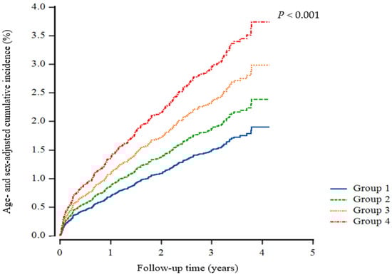Cox regression cumulative incidence curve for ischemic heart disease. Group 1, control of uric acid without CKD; Group 2, elevated uric acid without CKD; Group 3, control of uric acid with early CKD; Group 4, elevated uric acid with early CKD.